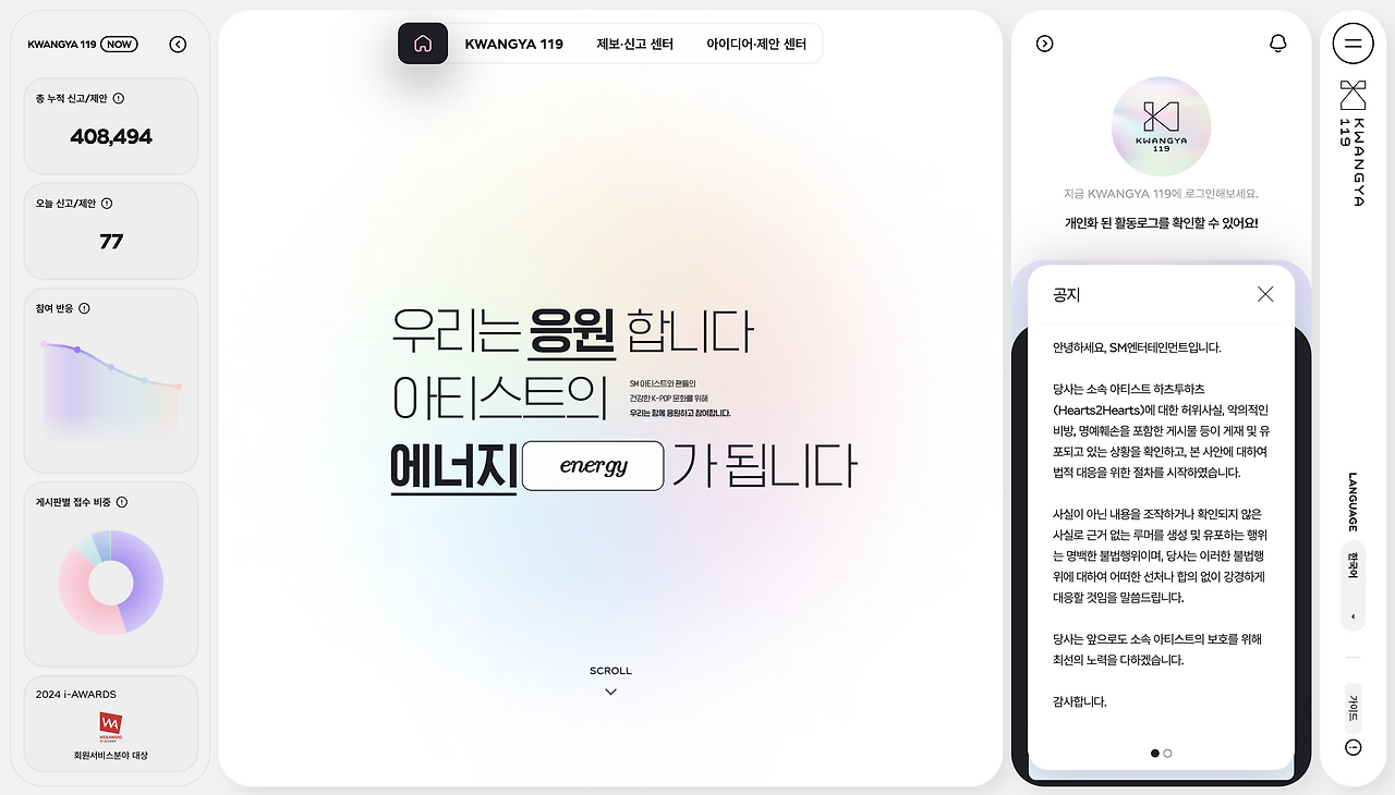 이안 건 역시 같은 양상으로 흘러갈 가능성이 높습니다. SM에서 제공하는 소통 서비스 플랫폼 ‘광야 119 (KWANGYA 119)’에는 이미 하츠투하츠에 대한 허위사실, 악의적 비방, 명예훼손을 포함한 게시물에 대한 강경 대응을 예고하는 공지가 등록되었죠. 🚨 하츠투하츠는 차질 없이 예정된 스케줄을 이행할 것이며, 팬덤 '하츄 (S2U)'는 앞서 언급한 하츠투하츠의 세 가지 강점을 무기로 한동안 연이은 증가폭을 보여줄 것입니다. 이안의 행보에 지독히 따라붙을 듯 억세 보이는 이번 의혹은, 언제 그랬냐는 듯 금세 자취를 감추겠죠.